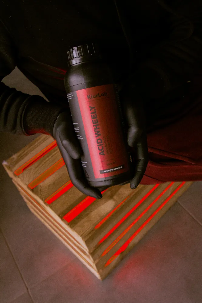 Po zakończeniu czyszczenia z użyciem Acid Wheely zastosuj środek zasadowy, aby zneutralizować pozostałości kwasu i wyrównać pH na powierzchni felgi. Wyeliminujesz w ten sposób ryzyko powstania głębokiej korozji lub degradacji czyszczonej powierzchni. Dokładnie spłucz felgę wodą, spryskaj ją środkiem zasadowym (np. KiurLab Wheely) i pozostaw na chwilę, aby preparat dotarł do trudno dostępnych miejsc. W razie potrzeby użyj pędzelka. Na koniec wypłucz dokładnie oba preparaty silnym strumieniem zimnej wody.